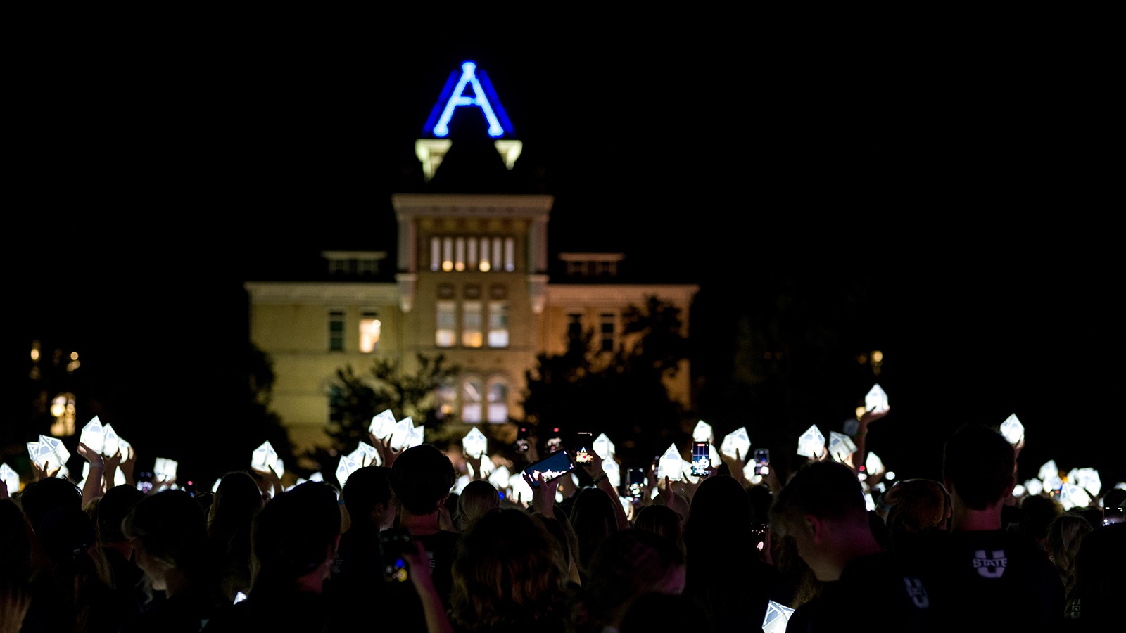 Students celebrate the 2022 Luminary tradition. Lighting the "A" blue during the Luminary is one of several USU traditions associated with the Old Main Bell Tower lights.